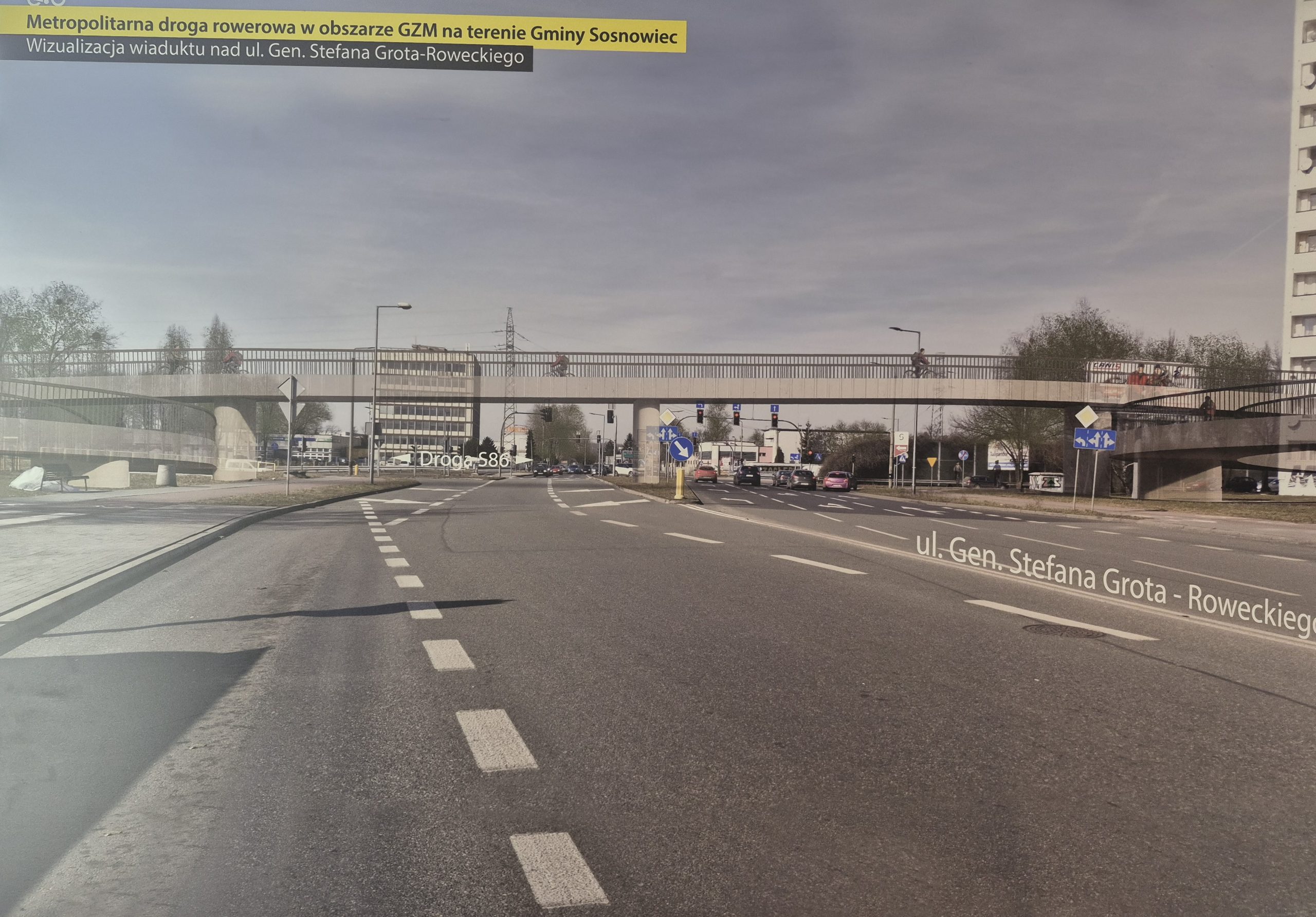 Sosnowiecki odcinek velostrady rozpocznie się w rejonie skrzyżowania trasy S86 z ulicami Piłsudskiego i Baczyńskiego i poprowadzi wzdłuż trasy szybkiego ruchu, a potem przez teren dawnej stacji kolejowej Sosnowiec Pogoń, tunelem pod aleją Mireckiego i po śladzie linii kolejowej w rejon ślimaka. Powstaną także dwa odgałęzienia: jedno wzdłuż trasy szybkiego ruchu w rejon Żylety, a stamtąd docelowo do Będzina i Dąbrowy Górniczej, a drugiej przez wiadukt pokolejowy nad S86 przy dawnej Premie-Milmet i po śladzie dawnych torów kolejowych do Piasków i Czeladzi. Nad ulicami Piłsudskiego i Grota-Roweckiego pojawią się specjalne bezkolizyjne kładki dla rowerzystów.