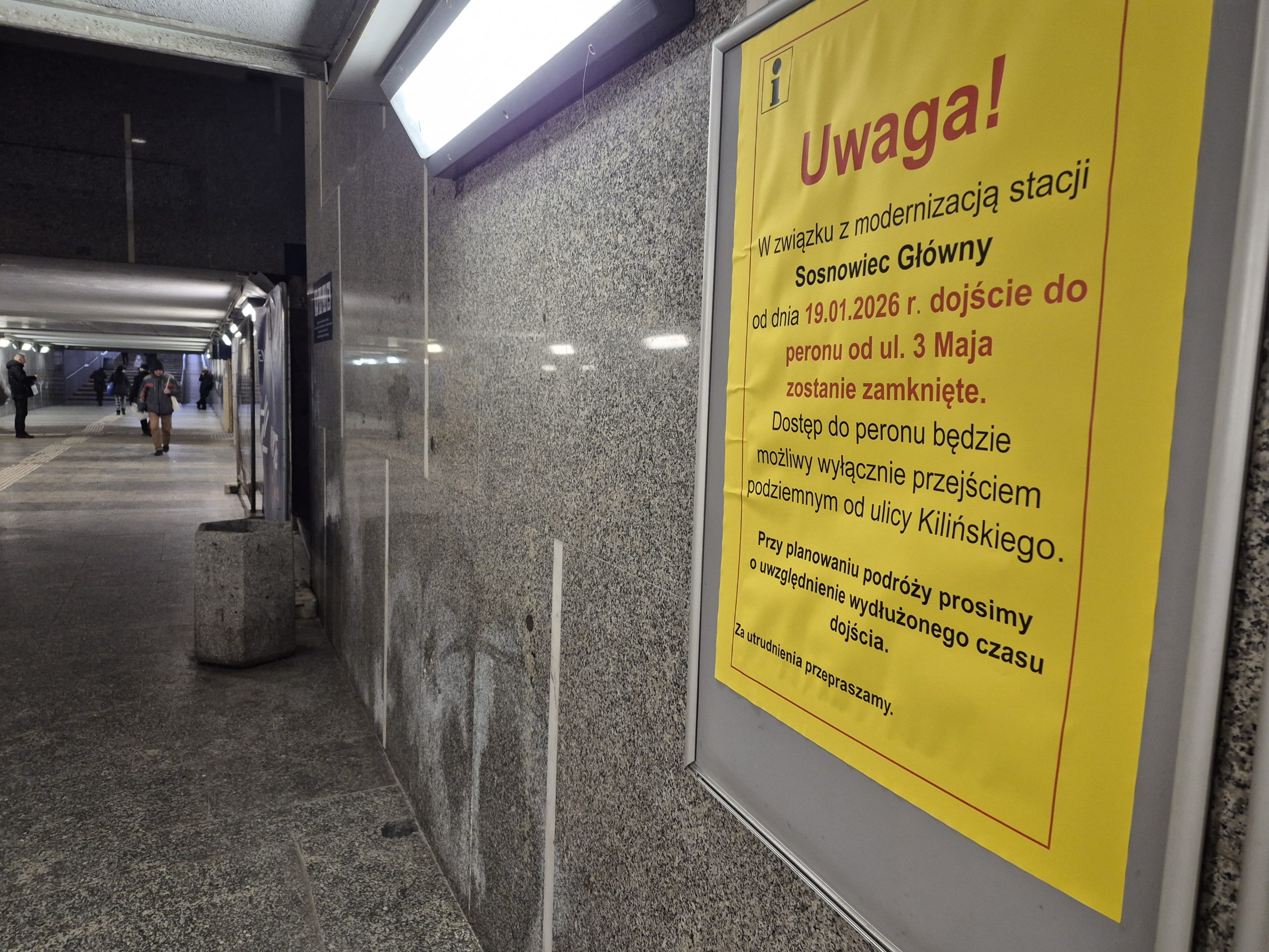 – W styczniu zacznie się przebudowa przejścia podziemnego i budowa nowego wejścia na peron 2. Po wyburzeniu starego segmentu, wybudujemy nowy z windą i schodami na peron. Ten zakres prac wymaga zmian w komunikacji. Od 19 stycznia dojście do peronu od strony ul. 3 Maja zostanie zamknięte. Dostęp będzie możliwy przejściem podziemnym od ul. Kilińskiego i wydłużoną o 1 km drogą przez ul. Piłsudskiego. Przy planowaniu podróży prosimy o uwzględnienie dodatkowych 15 min na dojście do stacji od strony centrum miasta. Zmiany będą obowiązywały do 20 kwietnia – przekazuje Katarzyna Głowacka z zespołu prasowego PKP PLK. – Rozumiemy trudności, jakie powoduje zamknięcie przejścia, jednak skala inwestycji nie pozwala na wyznaczenie bezpiecznej drogi przez czynne tory i plac budowy na stacji Sosnowiec Główny – dodaje.